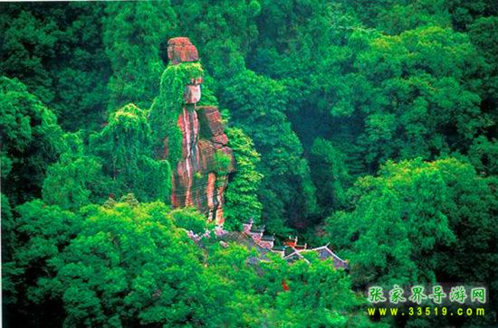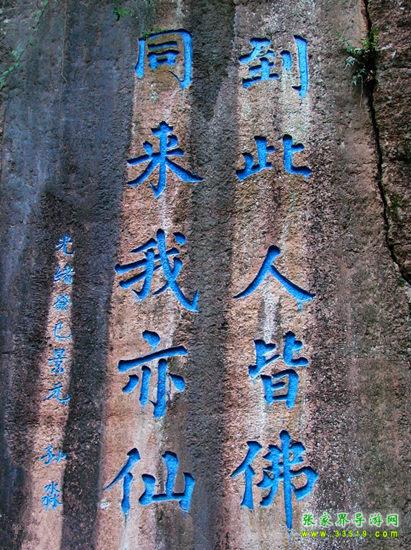 不二門內由石灰?guī)r風化形成的一尊巨大石佛,聳立于萬綠叢中,高六丈,青冠白面,頭頂白云,腳踏碧水,人們以其形神稱為“觀音巖”?!队理樋h志》稱“觀音巖素有‘湘景名峰第一巖’之稱”。觀音巖下,聳立著一組瑰麗多姿、古色古香的殿閣建筑群,這就是“嵩山堂”,包括三觀殿、玉皇閣和禪房客舍,工藝精巧,玲瓏別致。特別是正殿后的地藏庵,與老司城明代建筑祖師殿結構相似,背倚石壁,右通八陣圖,左達熱水坑,周圍怪石森列,古木參天。觀音巖北部山上是天造地設的“八陣圖”,有的如排戟,有的似春筍;有的像古佛,有的若走獸。八陣圖之奇,不僅在于它林立的怪石,最主要的是在于由龜裂紋石板鋪成的時上時下時隱時現(xiàn)的彎彎小徑——或穿過地下幽深的石洞,或延展于密林雜草叢中,或環(huán)繞于奇峰怪石之間,使八陣圖的東、南、西、北四門相通,復雜繁多的石徑互相連接形成網絡,人們有時難以找到出路。也許,這就是八陣圖命名的緣由。不二門內兩側石壁開闊如屏,歷代文人墨客或贊山水之幽絕,或抒心胸之豪情,雕鑿了種種摩崖石刻。據《永順縣志》記載,不二門石刻有神秀獨鐘、吾道南來、白云門開、砥柱中流、眼前南海、百寶勝光、別開生面、別有天地等100多處。歷經風雨滄桑之后,現(xiàn)僅存鬼斧神工、勝境無雙、滌盡塵氛、瞻奇仰異、海上飛來等數十處。清代名士白介庵所作《松徑留云》、《古洞仙蹤》、《層閣聳翠》、《玉嶂屏環(huán)》、《澄潭月影》等觀音巖八景詩尚凸現(xiàn)在石壁之上。其中《石門天鑿》一詩完整無缺:“法門高聳五云偎,鬼斧神工妙化裁。鞭石無痕還著相,振山有鐸不須錘。地沾花雨千歧坦,道接薪傳一線開。莫道終南稱捷徑,巨靈神辟小蓬萊。”清代庚辰年間的探花景元,曾在石壁上題刻“到此人皆佛,同來我亦仙”。他還以一筆揮成的“山青海岸”疊字如圖似的符合成一個“岸”字鑿刻在摩崖之上,堪稱罕世之作。石壁上近年來還鐫刻了偉人毛澤東的詩詞和儒將蕭克、畫家黃永玉等巨擘的題字,游人置身其間,飽享山水美景、名勝古跡與文化藝術的熏陶。