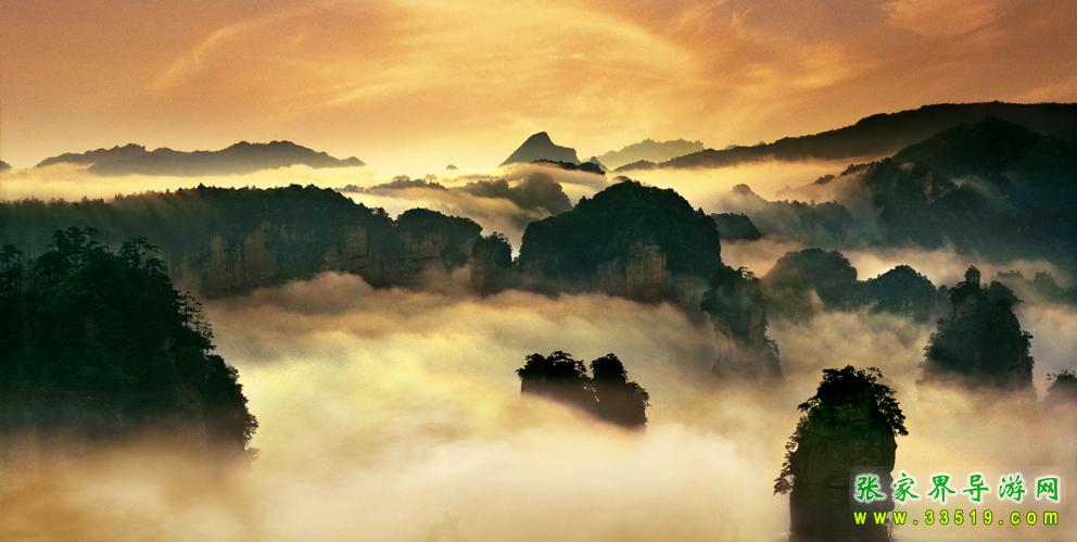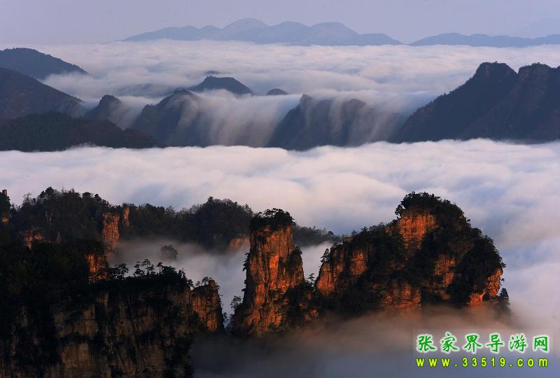 武陵源獨特的石英砂巖峰林在均屬國內外罕見,在360多平方公里的面積中,目前所知有山峰3000多座,這些突兀的巖壁峰石,連綿萬頃,層巒疊嶂。每當雨過轉晴或陰雨連綿天氣,幽幽山谷中生出了云煙,云霧飄緲在層巒疊嶂間,云海時濃時淡,石峰時隱時現(xiàn),景象變幻萬千。霧,使晴日下堅硬的山峰變得妖嬈、飄逸和神秘。觀霧的最好季節(jié)是夏季,天子山是賞霧的最佳去處,也是攝影家常常涉足的地方。