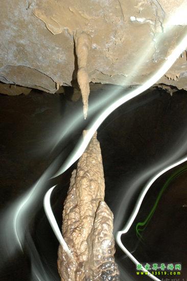 在這兒向您介紹一點溶洞學的知識。在溶洞中,自洞頂往下生長的叫石鐘乳,自洞底往上生長的叫石筍,兩者相向生長連在一起就叫石柱,三者統(tǒng)稱為鐘乳石。這兒有一根石鐘乳與一根石筍是相對生長的,差一點點就要連起來了,但他們卻永遠不能合在一起,因為上面的石鐘乳已經(jīng)沒有滴水,已經(jīng)失去了生命力。這好像一對苦苦守望的情人,近在咫尺,卻永遠不能相逢。于是人們便給他們?nèi)×艘粋€非常動人的名字——恨難逢。“盈盈一水間,脈脈不得語。”“天涯海角有窮時,只有相思無盡處。”在無數(shù)個春去秋來的日子里,他們該有多少離愁別緒?。?mdash;—真不知道是石頭多情,還是人多情?——而有的人說得很樂觀,“兩情若是長久時,又豈在朝朝暮暮”,所謂“距離產(chǎn)生美”嘛。