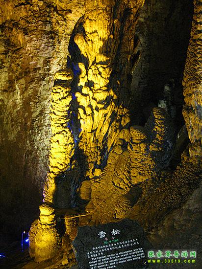 “大雪壓青松,青松挺且直。要知松高潔,待到雪化時。”這根高大的石筍就像一棵被大雪覆蓋得嚴嚴實實的松樹。它的科學名稱叫做棕櫚狀石筍,一般只能在高大的廳堂中見到。據(jù)科學家測算,它已經(jīng)在悠悠的歷史長河中挺立了10萬年。有趣的是,在雪松根部還散落著許多可愛的小松果呢!