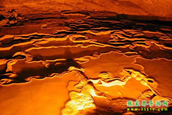 “黃‘龍’之水天上來”,這里洞頂與外界僅一層薄薄的巖石相隔,天上雨水匯集起來滲透巖層便形成黃龍洞內(nèi)流量最大的一股泉水——天仙水,其落差達27.3米。“飛流直下三千尺,疑是銀河落九天”,誰能想象洞中竟有這樣雄偉壯觀的瀑布?天仙水下面是層層疊疊的石梯田,連綿起伏,有人說這是龍王爺?shù)娜f頃良田。