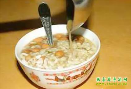 油茶湯對(duì)土家族人來說一日三餐少不了。土家油茶湯是張家界土家族具有代表性的包含文化現(xiàn)象之一,土家語稱“色斯?jié)缮?rdquo;,堪稱中國茶文化一絕,源遠(yuǎn)流長。據(jù)清代的古書記載:“土人以油炸黃豆,包谷,米花,綠焦諸物,取水和油,煮茶葉和湯泡之,餉客致敬,名曰:‘油茶’”。