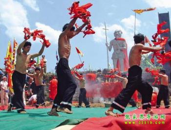 搖鈴隊(duì)伍圍圓圈有節(jié)拍的搖鈴。圓圈中另兩人面對(duì)面用肩共杠一根齊眉棍(木桿),左手叉腰,右手扶棍。從棍上搭一疋絲帕,一氣功師進(jìn)來拿絲帕一頭,另一壯漢拿線帕另一頭。氣功師手拿絲帕慢慢下蹲,壯漢牢牢握緊絲帕。待氣功師翻天睡在地上后,其他人搬一床棉被蓋其肚部,再在上面放一塊木板,木板上放一副大石磨,石磨上架一套鐵犁、粑。氣功師睡在地上用右手打竹掛,口喊:"打個(gè)陰陽一只"!把竹掛打在地上,掛未成陰陽一只時(shí),還要繼續(xù)打,直到打成,才把放在氣功師肚部的所有東西取下,氣功師雙手握緊絲帕慢慢起身站立。表演結(jié)束。