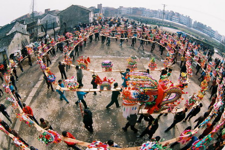 龍舞是中國民間體育藝術。大庸境內(nèi)的板凳龍是 別具一格的龍舞形式。尤其桑植縣白族人民,對舞板 凳龍有著特殊偏愛。 白族同胞耍板凳龍,相傳起于漢代,由白族先民 “舞龍求雨”的宗教活動演變而來。 板凳龍有兩種樣式。一種是簡式板凳龍,由二個 舉長凳為頭,一人在后選適當“舞臺”表演;另一種 是“篾扎板凳龍”,即用竹篾扎成龍形置于板凳之上 ,以木腳示龍爪,造型美觀,逼真。耍板凳龍又分兩 種舞式,一為獨凳龍,一為九節(jié)龍(九張板凳相接)。 舞板凳龍動作有“二龍搶珠”、“黃龍穿花”、“二 龍戲水”、“金蟬脫殼”、“黃龍盤身”等。永順、 慈利還流行草把龍,其龍耳稻草扎成。龍舞還有“干 龍”、“濕龍”之分,“干龍”多為娛樂,“濕龍” 則為求雨。“龍”到之處,百姓必潑水助威,舞者一 身透濕,盛為熱烈歡快。