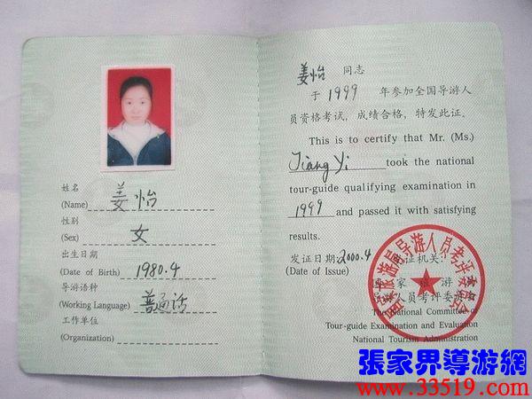 | 姜怡,女,導(dǎo)游員資格證書(shū)編號(hào):Hun990125。 大專(zhuān)學(xué)歷,自99年9月森林保護(hù)節(jié)前開(kāi)始從事導(dǎo)游工作,同年十二月參加全國(guó)導(dǎo)游員資格考試,并以?xún)?yōu)異成績(jī)?nèi)〉谩皣?guó)導(dǎo)證”,現(xiàn)為張家界華天國(guó)旅旅行社的專(zhuān)職導(dǎo)游員。整個(gè)帶團(tuán)期間,無(wú)論團(tuán)隊(duì)或散客,未出現(xiàn)一次旅游事故或游客投訴事件,普遍反映帶團(tuán)效果好。 | 導(dǎo)游自述