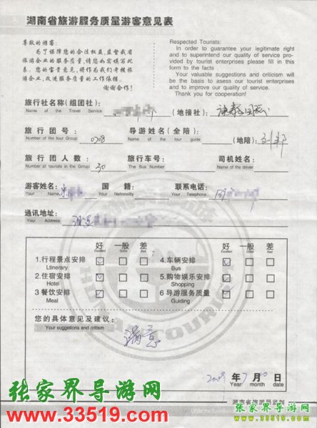 2009年7月8日汨羅朱先生一行30人質(zhì)量接待反饋單: