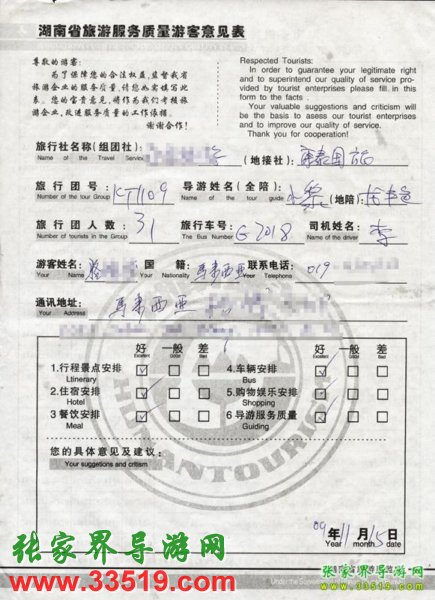 2009年11月9日馬來西亞駱先生一行31人旅游接待質(zhì)量反饋單: