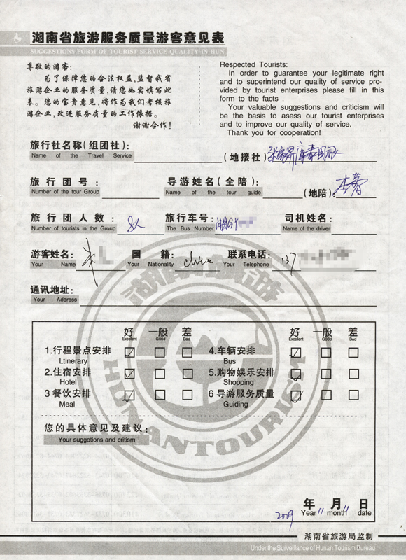 2009年11月11日朱先生一行8人旅游接待質(zhì)量反饋單: