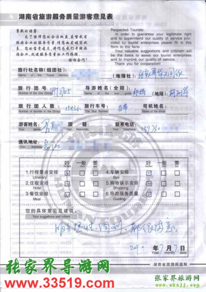 2010年7月7日岳陽暑先生一行18位旅游質(zhì)量反饋