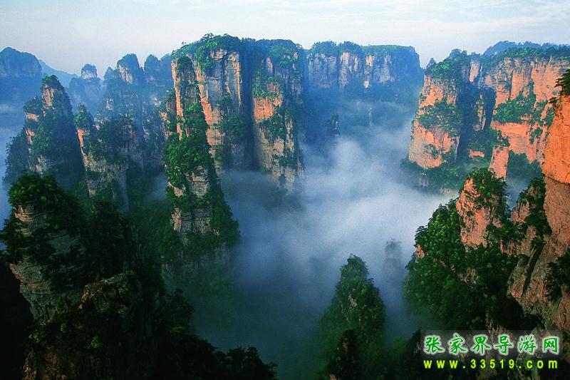 第二天早上,我們參觀了袁家界的風(fēng)景,其中最有名的當(dāng)然數(shù)天下第一橋,這是由兩座巖石山的山頂自然生長(zhǎng)在一起,非人所能為也。天下第一橋的稱號(hào)當(dāng)之無(wú)愧啊。當(dāng)然在袁家界,后花園也是不能不看的。張家界號(hào)稱“峰三千,水八百”,在這里你就能明顯的感覺(jué)到這句話的前半句是那么的實(shí)在??赐?a class="insidelink" href="http://www.chenggufj.com/" title="張家界">張家界的核心袁家界,我們乘車到了天子山(張家界景區(qū)內(nèi)的最高的地方)。玩了賀龍公園、御筆峰、仙女散花、西海、石船出海、仙人橋、天子廟、十里畫廊、一步難行。不巧的是,那天山上下了一點(diǎn)陣雨,雨后一條彩虹掛在天上,更重要的是山上起了一點(diǎn)霧,使整座山都籠罩在霧中,若隱若現(xiàn),看上去就象是在云海中,好象老天特地配合我們似的,難得一見(jiàn)的西海等正好被我們趕上了。江導(dǎo)告訴我們,這樣的機(jī)會(huì)是很難得的,可能是張家界為了感謝我的再次到來(lái),給了我一個(gè)特別的禮物吧。我大笑。晚上趕到昨天住的地方去住宿。不提。